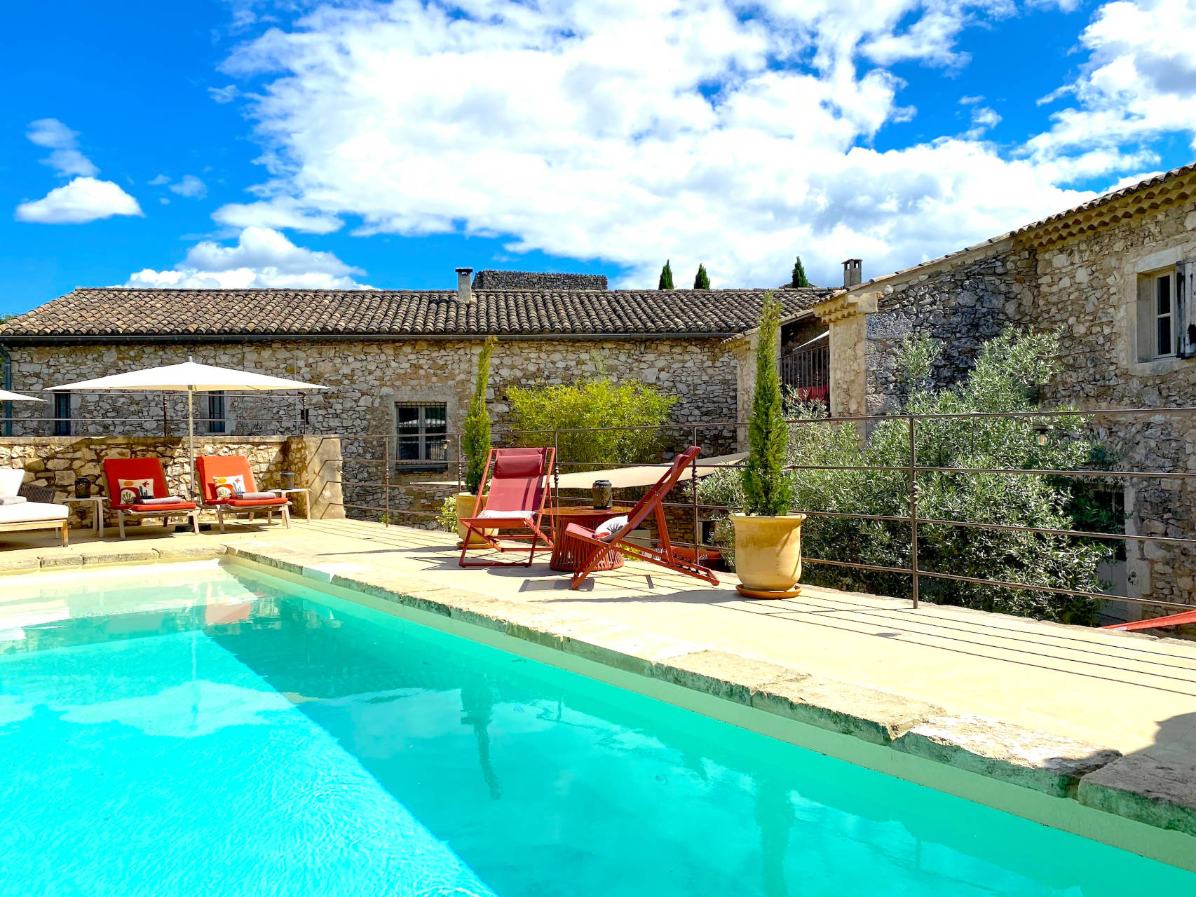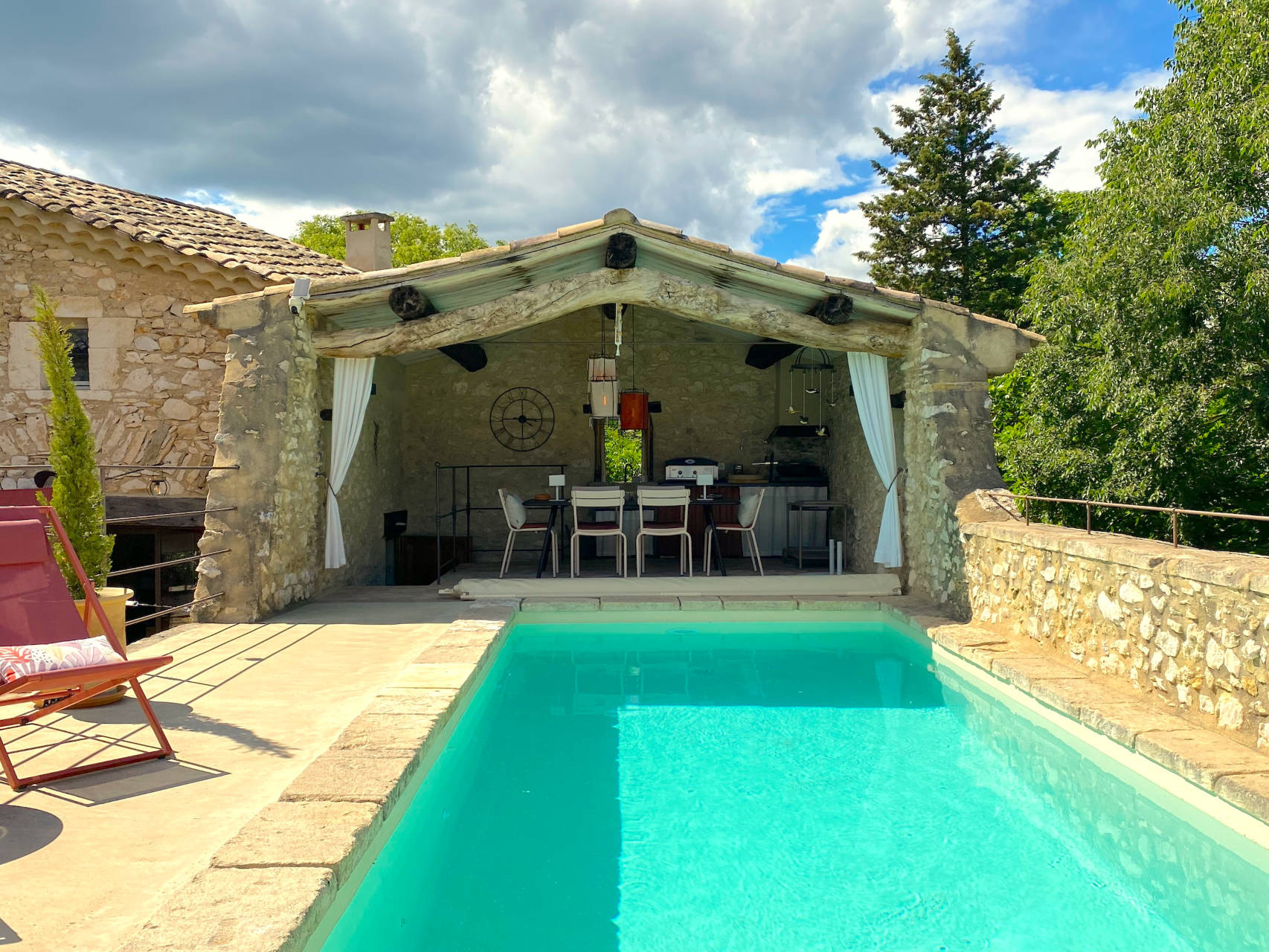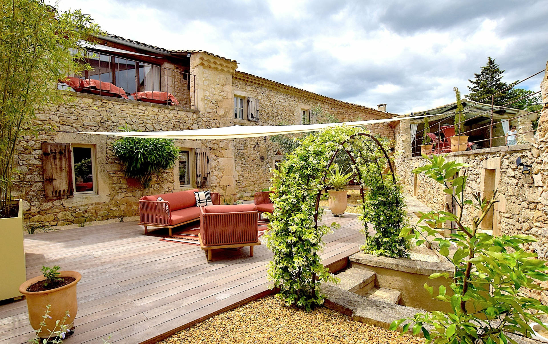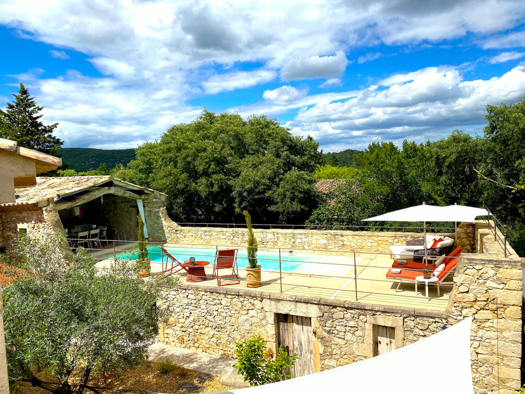 Surrounded by orchards, vineyards and lavender fields, in an idyllic hamlet 25 km from Uzès, among the green hills of the Cèze valley, this old stone house has been superbly renovated. The use of noble reclaimed materials such as oak beams and old terracotta tiles, combined with polished concrete floors and beautiful ironwork, has transformed it into a superb family home. The 82 m2 living room offers an incredible feeling of space and light, with a fireplace on one side and a fitted kitchen on the other. Its cathedral ceiling, dressed in reclaimed woodwork, further reinforces the impression of volume. With a total of four magnificent bedrooms, each with its own private bathroom and all worked with terracotta, woodwork and tadelak, the night space reflects a harmony of colors and materials conducive to calm and serenity. In terms of the exteriors, the garden has been designed for minimum maintenance and is complemented by terraces sheltered by suspended sails. Opposite the house, the swimming pool has been cleverly positioned overhanging, thus dominating the surrounding countryside. Created from an old outbuilding, this space benefits from a beautiful summer kitchen with dining room... This gem awaits you, turnkey, with all the necessary furniture and equipment, ready to welcome you for the beautiful days of summer. THIS PROPERTY IS UNDER CONTRACT.