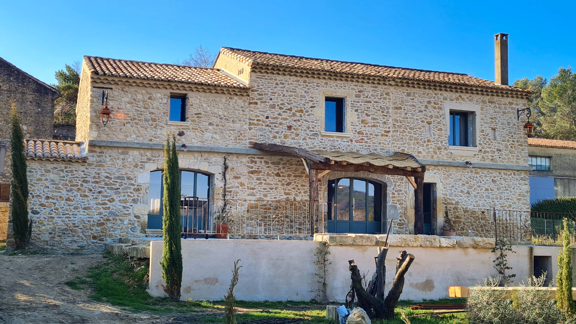 The Uzes Residences real estate agency presents this exceptional character property for sale, consisting of a renovated stone farmhouse and its outbuildings. In a charming village in the Gard Provençal offering all shops within walking distance, this stone building occupies a dominant position on its 2400 m2 plot. Entirely renovated by opening up the spaces to create an atmosphere that is both refined and warm, the main house, of 200 m2, offers an open-plan ground floor with a spacious fitted kitchen with concrete worktops - completed by an adjoining laundry room/pantry. The dining room, in a central position, and the living room in its extension, benefit from large bay windows on either side, thus bringing beautiful light into the living rooms. An independent bedroom with shower room occupies the west wing of the property. Upstairs, a large landing with separate shower room, serves on the one hand two bedrooms with shower room/wc, and on the other hand, the master suite with its generous bathroom opening onto a terrace. Opposite the house, a large outbuilding houses an independent studio of 30 m2 as well as a workshop - garage of 60 m2. Under its canopy, living room and summer dining room rub shoulders with the pleasant swimming pool area. The land, fully enclosed, has been recently landscaped in a Provencal spirit. 2 automatic gates, underfloor heat pump heating for an A/A energy rating. A rare property offering a unique living environment. For more information, contact Uzes Residences Immobilier on