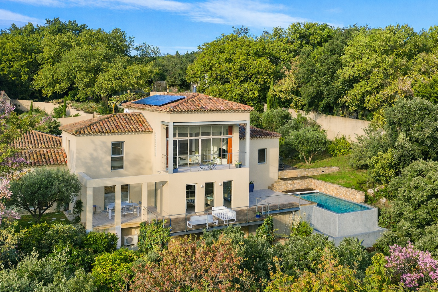 In the immediate vicinity of Uzès, in a privileged setting, this remarkable architect-designed house of 250 m2 (220 m2 of living space) sits at the heart of a 2,600 m2 wooded park, offering commanding views of the garrigue and vineyards. The nearest restaurants and amenities are just 5 minutes away. With its contemporary and elegant lines, the property impresses with its generous proportions and exceptional natural light, thanks to large bay windows and expansive glass walls. It is organized around a spectacular cathedral-ceilinged living room with a central fireplace, extended by a mezzanine TV lounge. The decidedly modern kitchen opens harmoniously onto the living room and a pleasant terrace. The main level features two en-suite bedrooms, each with a private entrance and terrace, offering comfort and privacy. Upstairs, a third suite with a bathroom, dressing room, and office space completes the accommodation. An independent studio, adjoining the double garage equipped with an electric vehicle charging station, completes this property. Open to the outside, the house has numerous terraces totaling approximately 90 m2, as well as a laundry room, plenty of storage space and a wine cellar. Outside, the infinity pool (9 x 3 m), heated and treated with salt, blends perfectly into the landscape. High-quality features: heat pump heating, photovoltaic panels, automatic watering system and motorized gate.