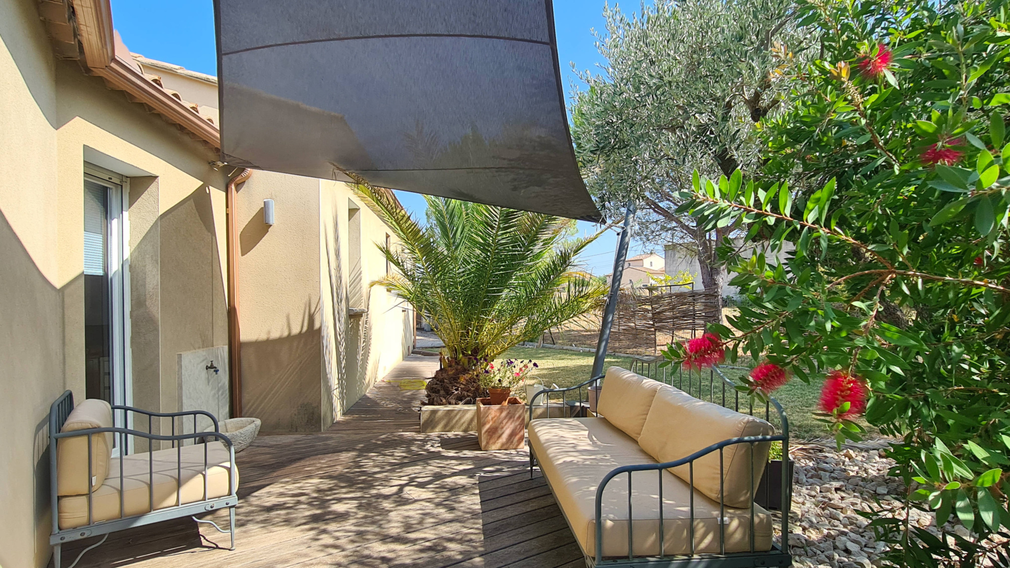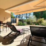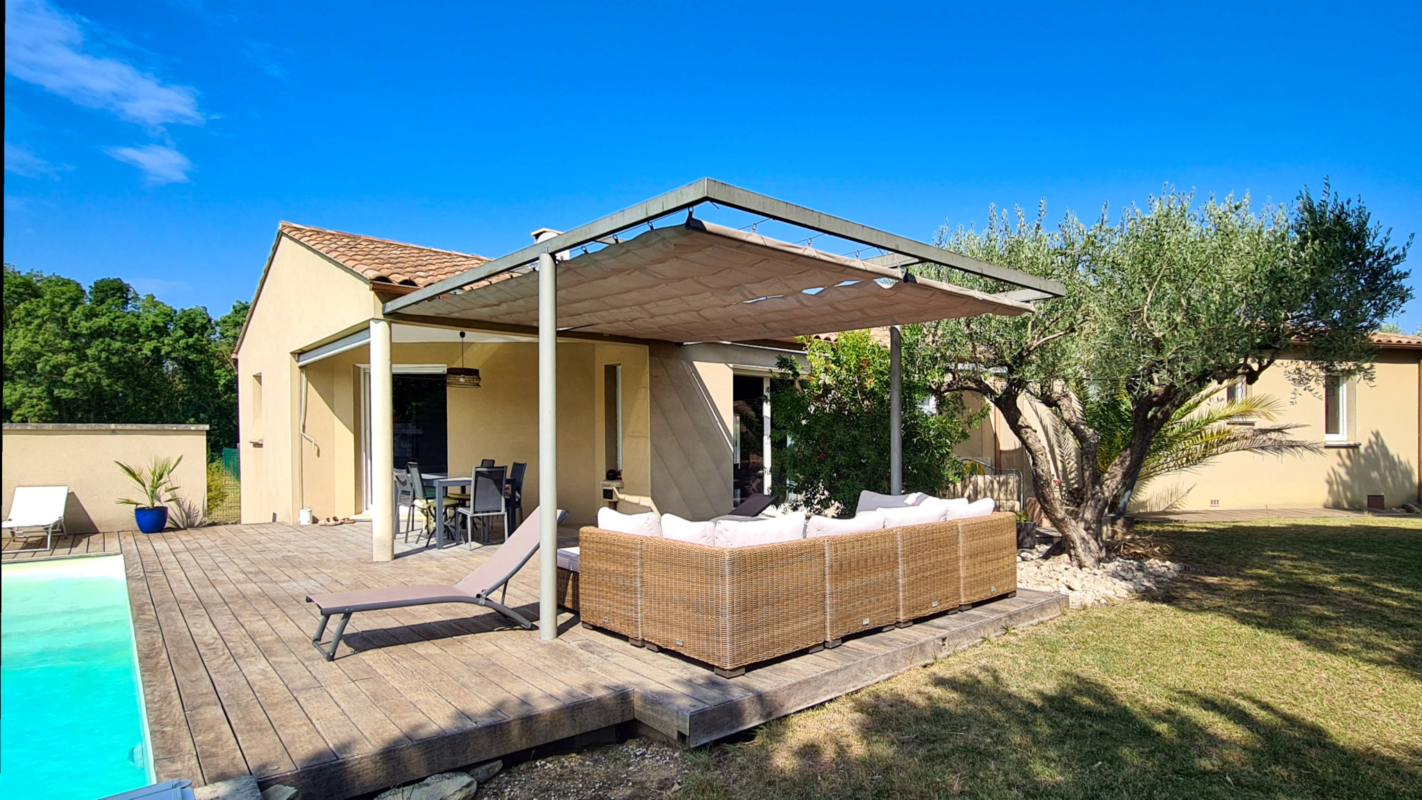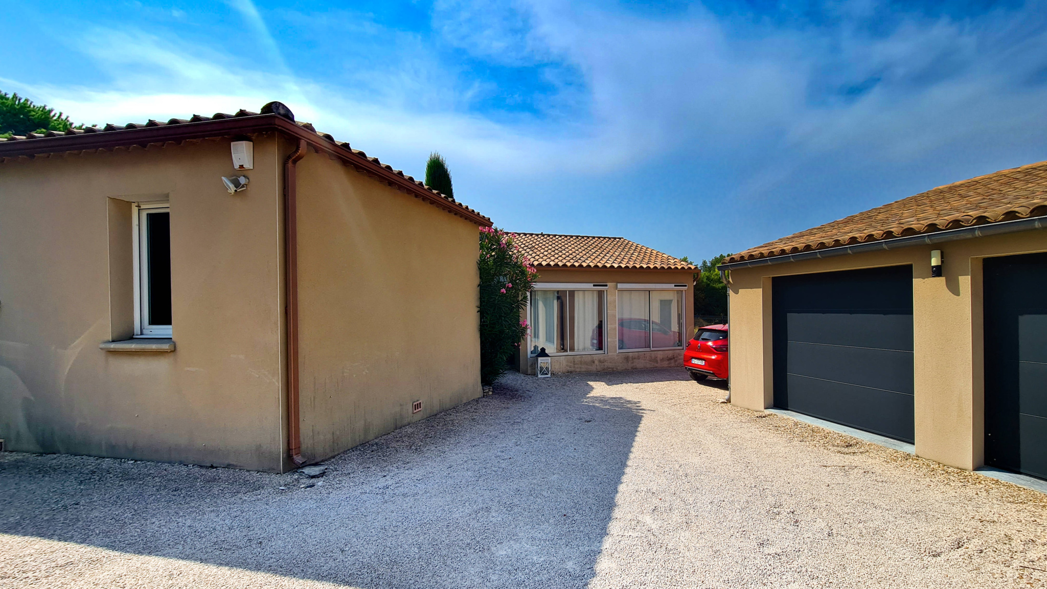 13 km from Uzès and in the immediate vicinity of a village with restaurants, grocery store and bakery (3 km), this contemporary single-story villa of approximately 160 m2 offers a privileged living environment, between countryside and vineyards, on an enclosed plot of 900 m2. The entrance is via a porch opening onto a hall which leads to a large living area consisting of a lounge with a wood-burning stove, a dining area and a fully equipped modern kitchen, complemented by a utility room/laundry room. This bright space opens onto a south-west-facing terrace and the pool area. At the front of the house, a spacious TV lounge with mezzanine/library benefits from two walls of bay windows, providing exceptional light. Next to the living room, the office opens directly onto a shaded terrace made of exotic wood. In the sleeping area, the master suite includes a fitted 'Schmidt' dressing room and a private bathroom. Two other bedrooms, each with a closet, share a bathroom with a bathtub and two sinks. This unit can be isolated from the rest of the house by a sliding door. Two wall-mounted toilets complete the living and sleeping areas. Outside, the 9 x 4 m salt-water swimming pool is equipped with an electric roller shutter and bordered by wide beaches with a summer lounge under a pergola with sliding sails. The property also has a double garage with automatic gate, ideal for vehicles, bicycles and various storage spaces. All modern comforts are present with reversible ducted air conditioning, underfloor heating, alarm system, water softener, electric roller shutters (some of which are solar), motorized gate and exterior lighting.